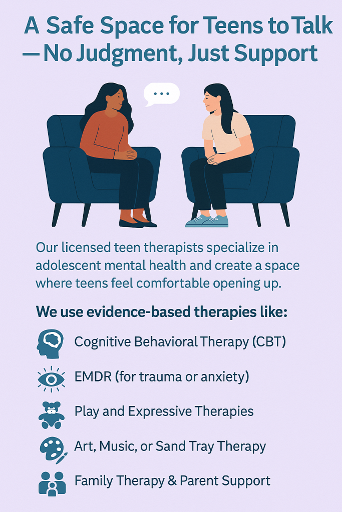 Our licensed teen therapists specialize in adolescent mental health and create a space where teens feel comfortable opening up. We use evidence-based therapies like: